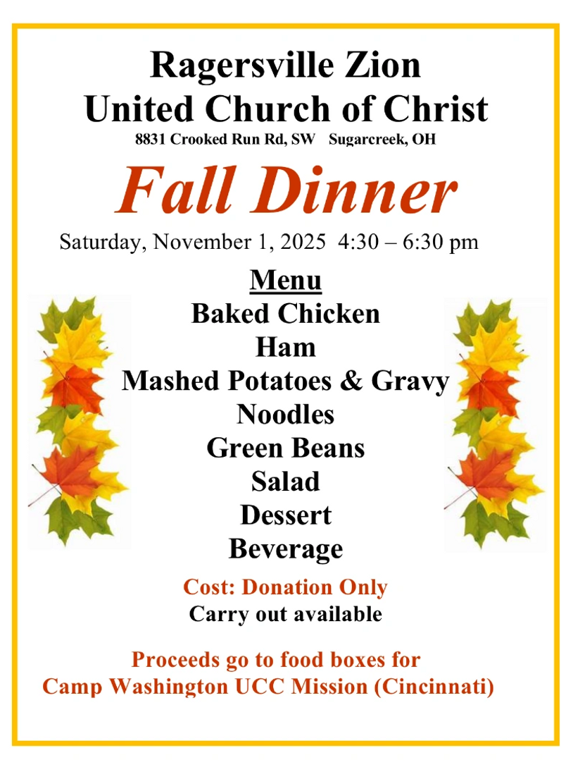 RAGERSVILLE ZION UCC - FALL DINNER NOV 1ST 2025 @ 4:30PM